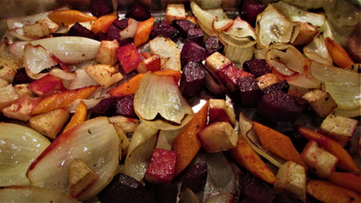 5. Check for doneness by pressing a fork into tougher veg such as rutabaga or celery root. Feel free to roast until caramelized by increasing heat to 425°F.